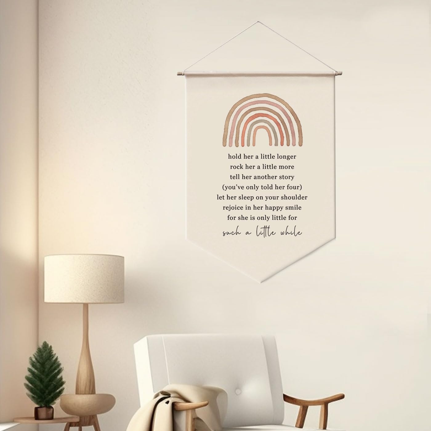 Elevate the charm of your baby girl's nursery with our exquisite "Hold Her a Little Longer" wall hanging. This touching piece not only serves as a beautiful focal point with its heartfelt message but also brings a sense of warmth to the room.